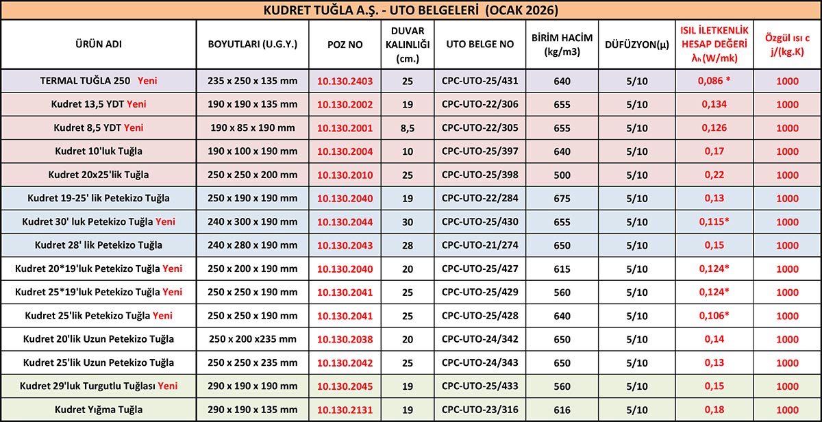 Yeni nesil 25 lik duvar için üretilen Kudret Petek İzotuğla Yeni TS 825 standardına göre 1. ve 2-3. Isı bölgelerinde mantolama gerektirmeden binanızın U değerlerini karşılamaktadır.